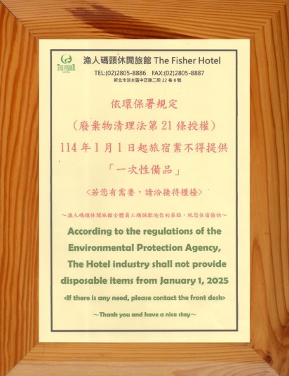 依环保署规定(废弃物清理法第21条授权)2025年1月1日起旅宿业不得提供一次性备品。若您有需要,请洽接待柜枱。