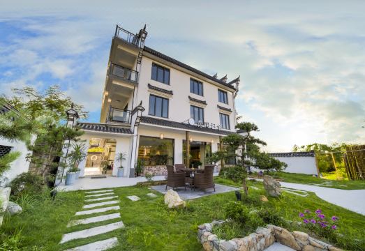民宿外观是古色古香的徽派建筑设计。青山远黛,白墙黑瓦。民宿拥有前庭后院,院中青竹摇曳,绿茵叠翠。错落有致的绿植在庭院肆意生长,还有假山、小桥流水、茶亭等元素点缀其中,可谓一步一景,尽显东方美学。