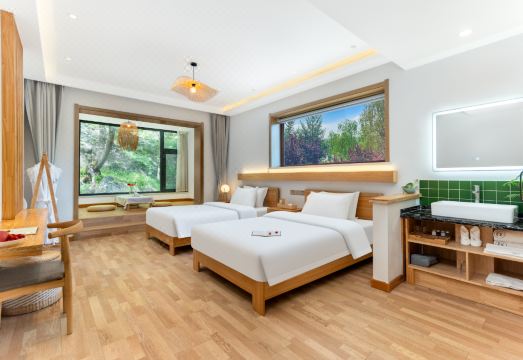 民宿位於五台山,依山而立。内部均采用原木环保材质,由无锡专业民宿设计师团队历时一年精心打造成五台山高端精品民宿。客房一室一景。可观山可赏月,每一间客房都有不同的风景。特有的星空房,大浴缸、客房内室茶席,电动屋顶天窗,自动窗帘;清新自然舒适的装饰可以消散旅途中所有的疲惫。清晨伴着鸟鸣声醒来,在温暖的阳光房里可享山泉水烹茶。还有宽敞明亮的禅修室,打坐放松舒适且温暖。入夜独有的星空浴缸,抬头就是星辰大海。清净自在独有的环境,一步一景领略四季变幻。春花秋月夏风冬雪,日月星辰人间好时节都在这里。禅堂,书画茶室,可静坐可抄经可品茶;大阳光房户外花园,可观景听风;屋顶还可以临水抚琴,各种公共空间设定。能满足各类游客来朝拜,游玩、度假、网红打卡、休闲放松静心的所有需求。无论您是携家旅行,还是独自参拜或是公司团建,民宿都是您不二的选择。“山水无常属,闲者是主人。”在这里有看不尽的自然风光,来春夏秋冬做自己的主人吧。