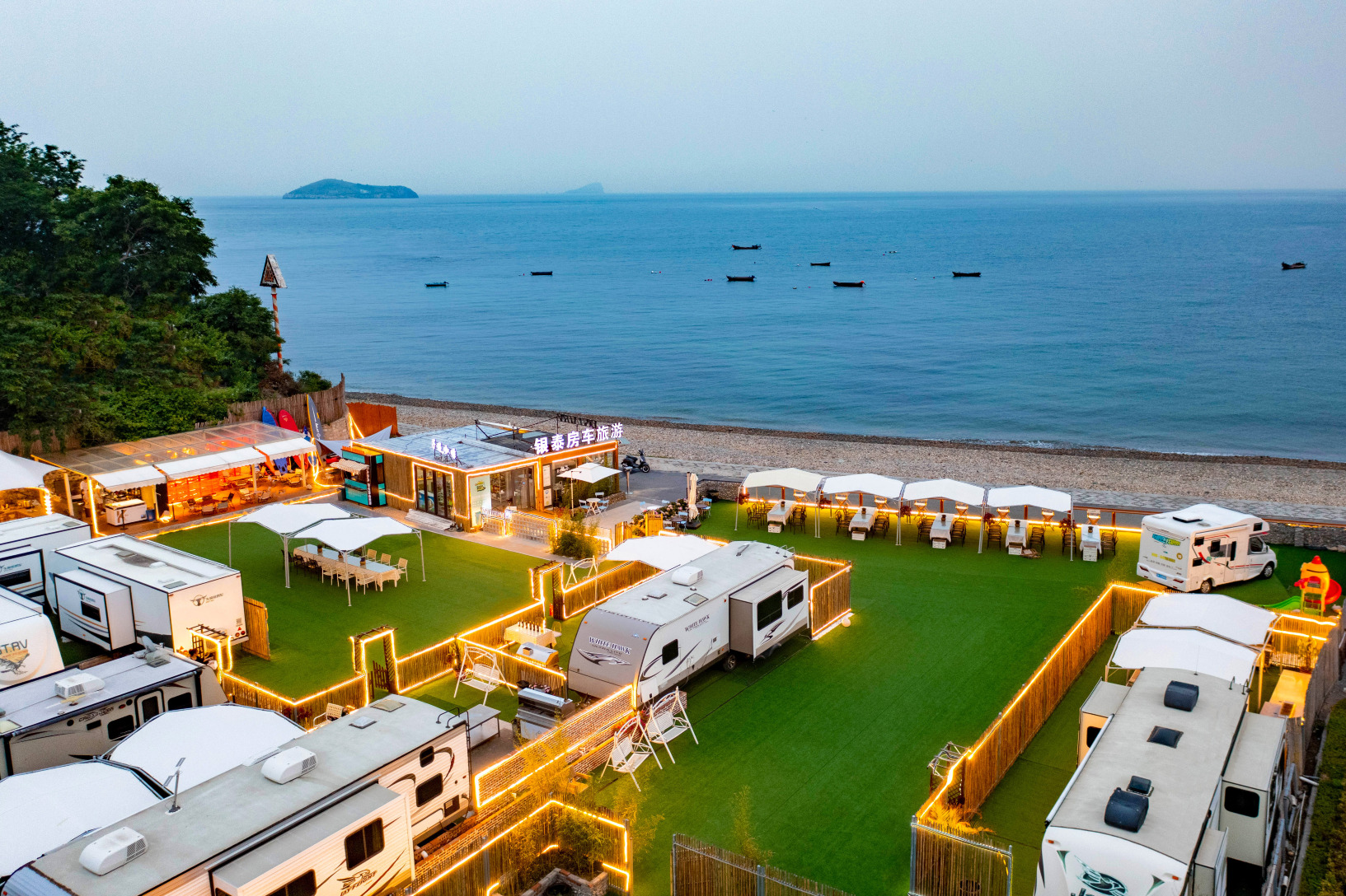银泰房车露营酒店(大连银沙滩店)位于大连滨海路东段,占地近3000平,约10米之内就是大海。酒店配备银泰房车服务站和银泰房车文化体验中心,拖挂式房车酒店,海滨咖啡厅,房车帐篷露营基地,团建游戏区,房车草坪婚礼区,音乐派对区、啤酒花园酒吧等。