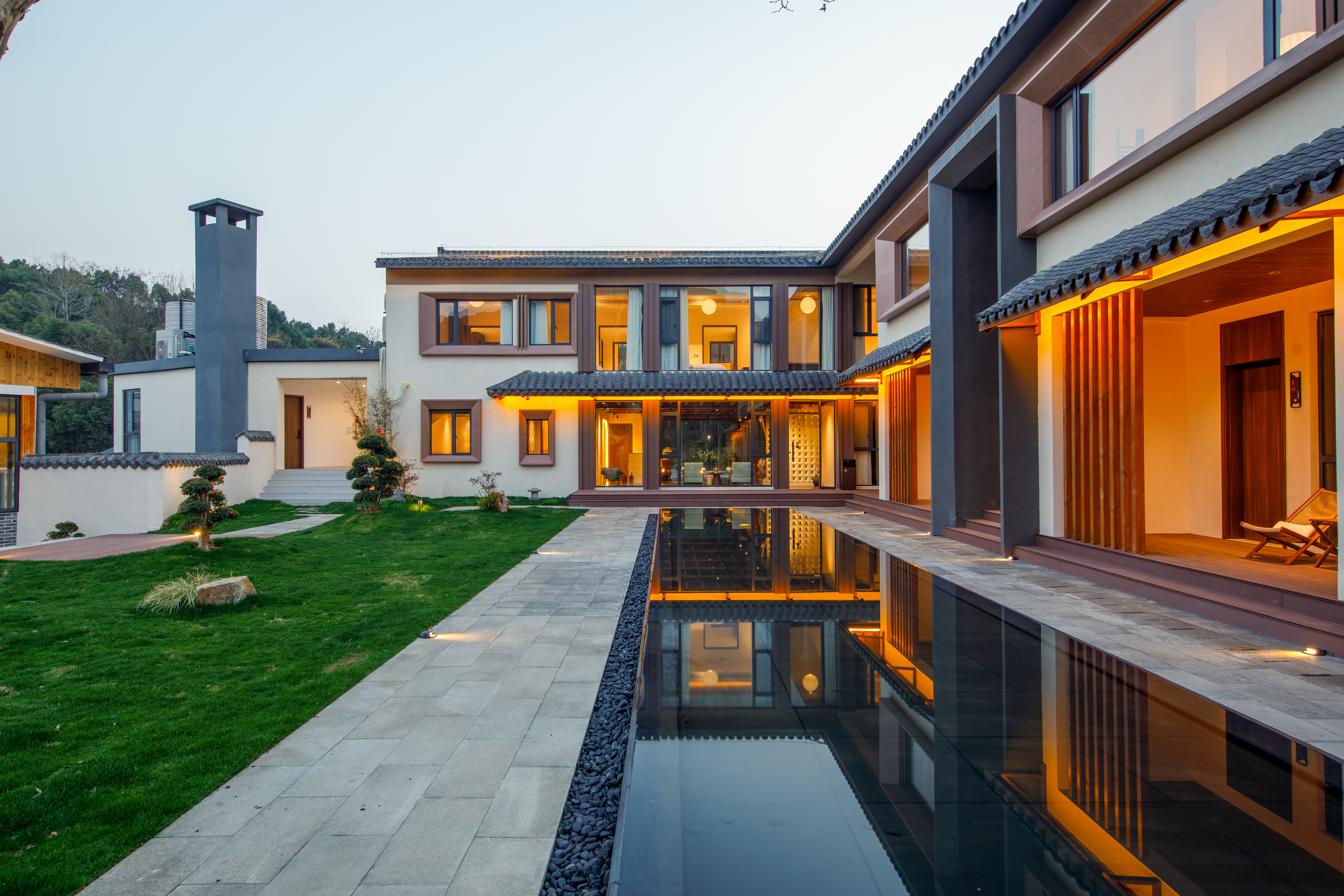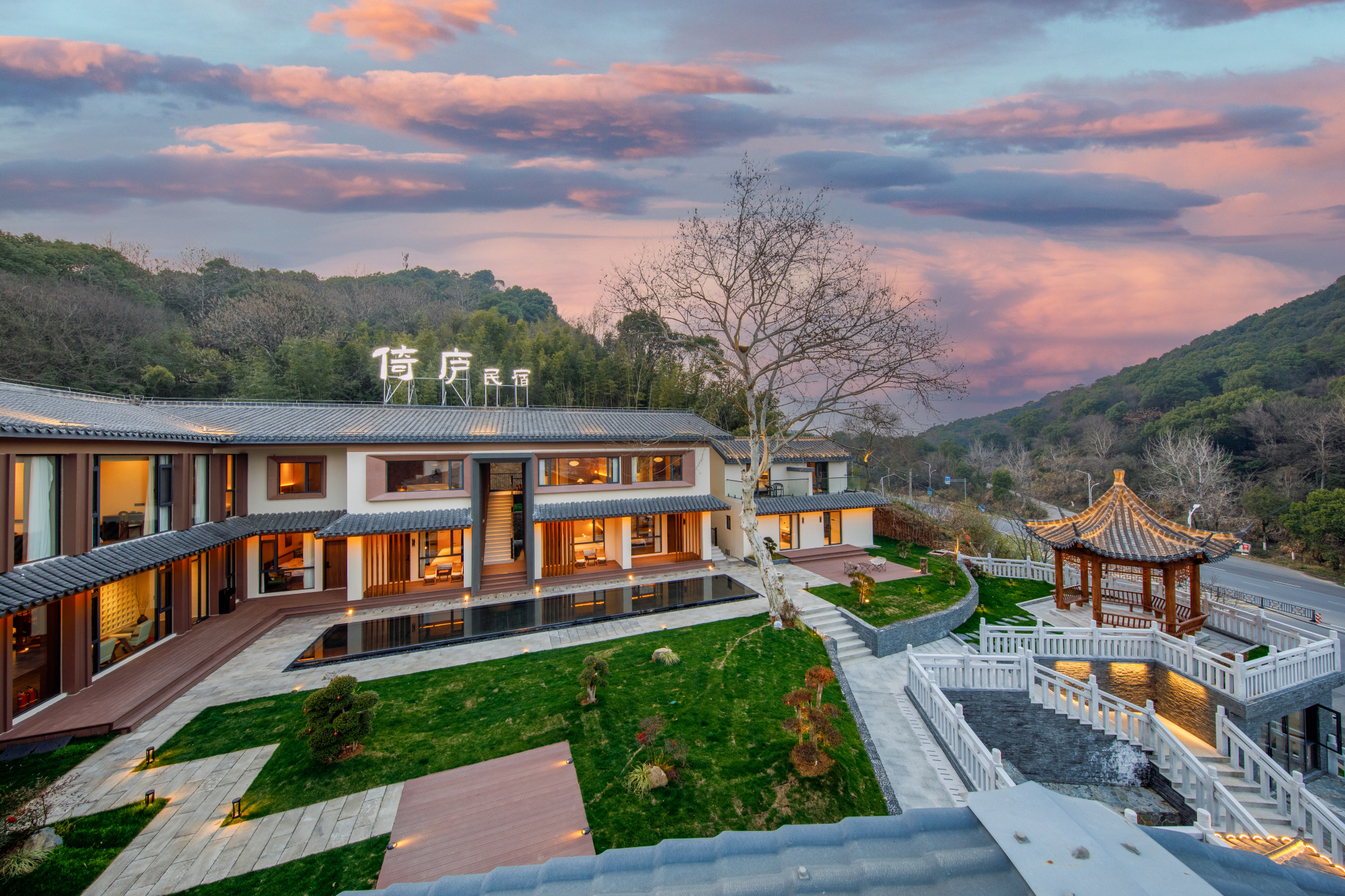 民宿,坐落于风景如画的山丘之上,是现代与传统完美融合的典范。民宿以白色为主色调,搭配灰色和棕色装饰,屋顶曲线优美,彰显文化底蕴。四周绿植环绕,远望群山连绵,黄昏时分天空橙黄,宁静而和谐。是远离尘嚣、享受自然与文化的理想之地。