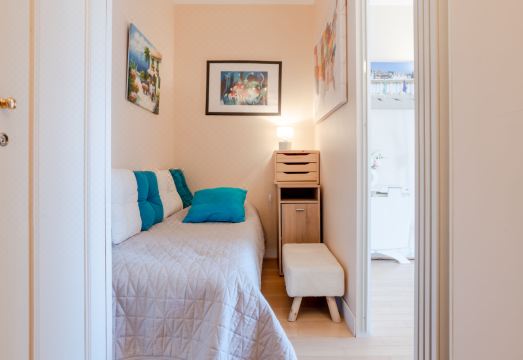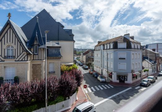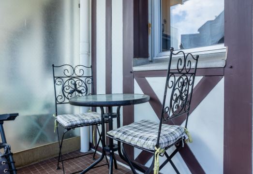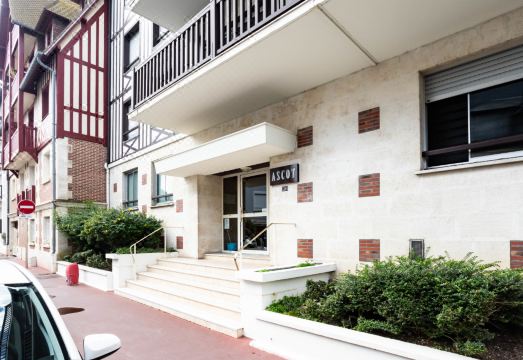 Deauville: Residence "Ascot", 3 storeys, terraced. In the resort, 350 m from the centre, in a quiet position, 1.4 km from the sea, 1.4 km from the beach, east facing position. In the complex: lift. (6 steps). Shop 350 m, supermarket 280 m, restaurant 100 m, bakery 60 m, 4 minute walk to the centre, bus stop "Gare routière" 500 m, railway station "Deauville-Trouville" 500 m, sandy beach "les planches de Deauville" 1.4 km, indoor swimming pool 1.1 km, thermal baths "thalasso de Deauville" 1.1 km. Golf course (18 hole) 3.7 km. Nearby attractions: casino de Deauville 1 km, hippodrome Deauville La Touques 1.2 km, Honfleur village normand 16 km, Mémorial de Caen 54 km, Arromanches plage du débarquement 80 km. The keys‘ handover takes place by the agency Interhome in Deauville. "Ascot", 1-room studio 26 m2 on 2nd floor, north-east facing position. Entrance hall. Living/dining room with 1 double sofabed (1 x 140 cm, length 190 cm), TV (flat screen). Exit north facing position and east facing position. Small kitchen (2 hot plates, dishwasher, microwave, grill, electric coffee machine). Bath/shower/WC. Large balcony 9 m2, east facing position. Terrace furniture, balcony furniture. Distant view of the resort. Facilities: Internet (WiFi, free). Please note: non-smokers only. Smoke alarm. Offer by a private individual according to? Art. 155, IV of CGI. 14220001500RJ