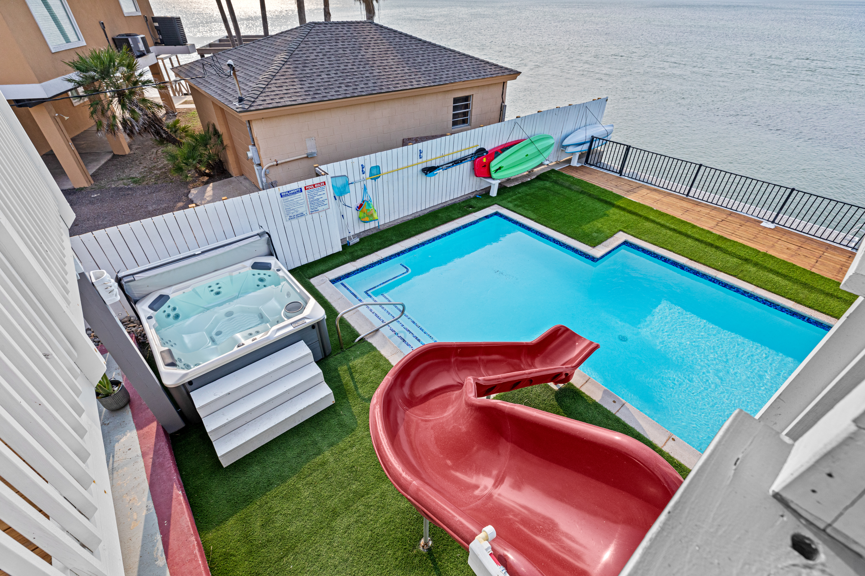 Walk out the back door to your own island paradise! You and your guests will enjoy sitting on the waterfront deck for morning coffee, mid-day lunch or evening nightcaps! If you get too warm in the amazing South Padre sun, cool off in the refreshing swimming pool that also overlooks the bay, or under the covered patio. Guests can fish right off the backyard day or night, or use the private boat slip for a stress free day out on the water! When you're ready to put your toes in the sand, the beach is just a short walk away.