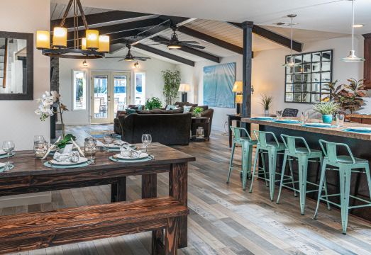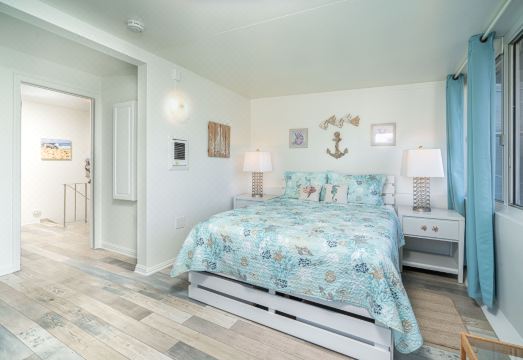 The home has 4 bedrooms, all upstairs. There is a master bedroom with a king bed, 2 guest rooms with queen beds and another guest room with a full bunk bed. All upstairs bedrooms share the bathroom in the hallway, there is also another full bathroom just down the stairs on the first floor next to the kitchen and dining area. The living room is cozy and has lots of seating, perfect for relaxing after a beach day or having a game night with the family. The living area opens out to the front patio where you can grill up meals or soak up some sun.