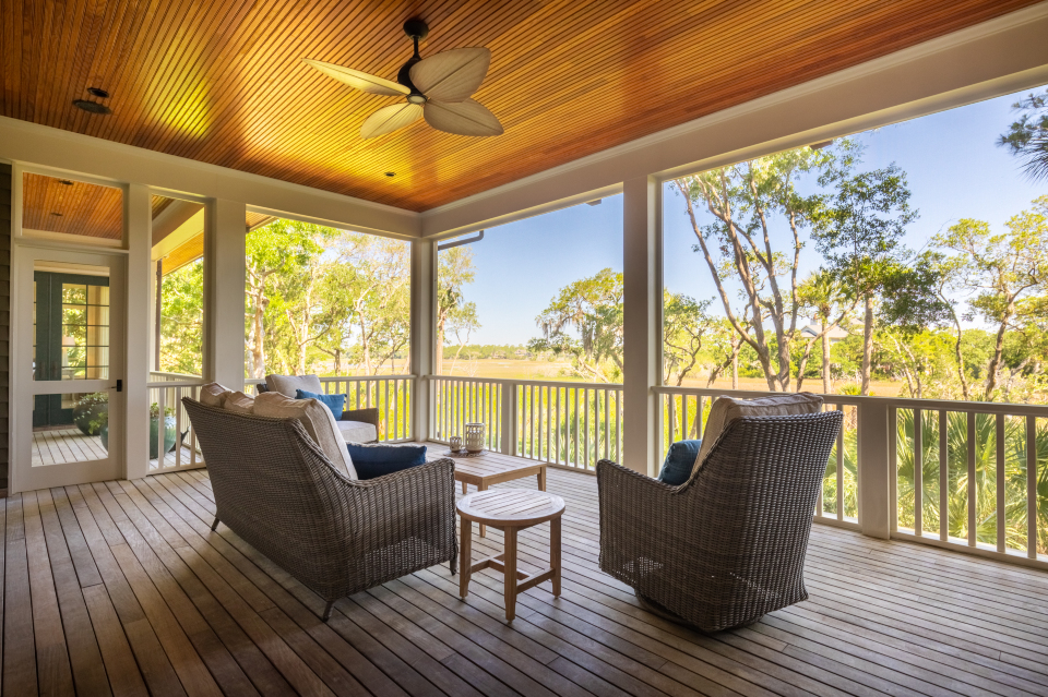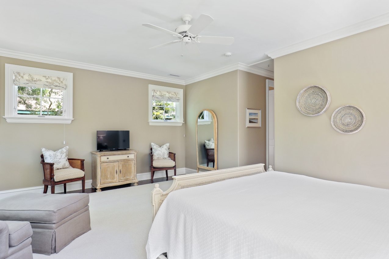 Custom wainscoting and a coffered ceiling with shiplap inlay enhance the first-floor master suite, which has direct access to a rear covered porch. It features a king bed and television. Decorated in warm hues reflective of the marshlands, the master bath offers dual vanities, a walk-in curbless shower, soaking tub, and marble flooring.
