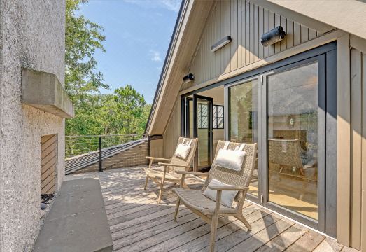 Designed for modern living, the second floor features two ensuite bedrooms, a full-sized laundry room, and a media room with custom built-ins for display and storage. The space has vaulted ceilings and opens onto the second floor balcony and outdoor fireplace.