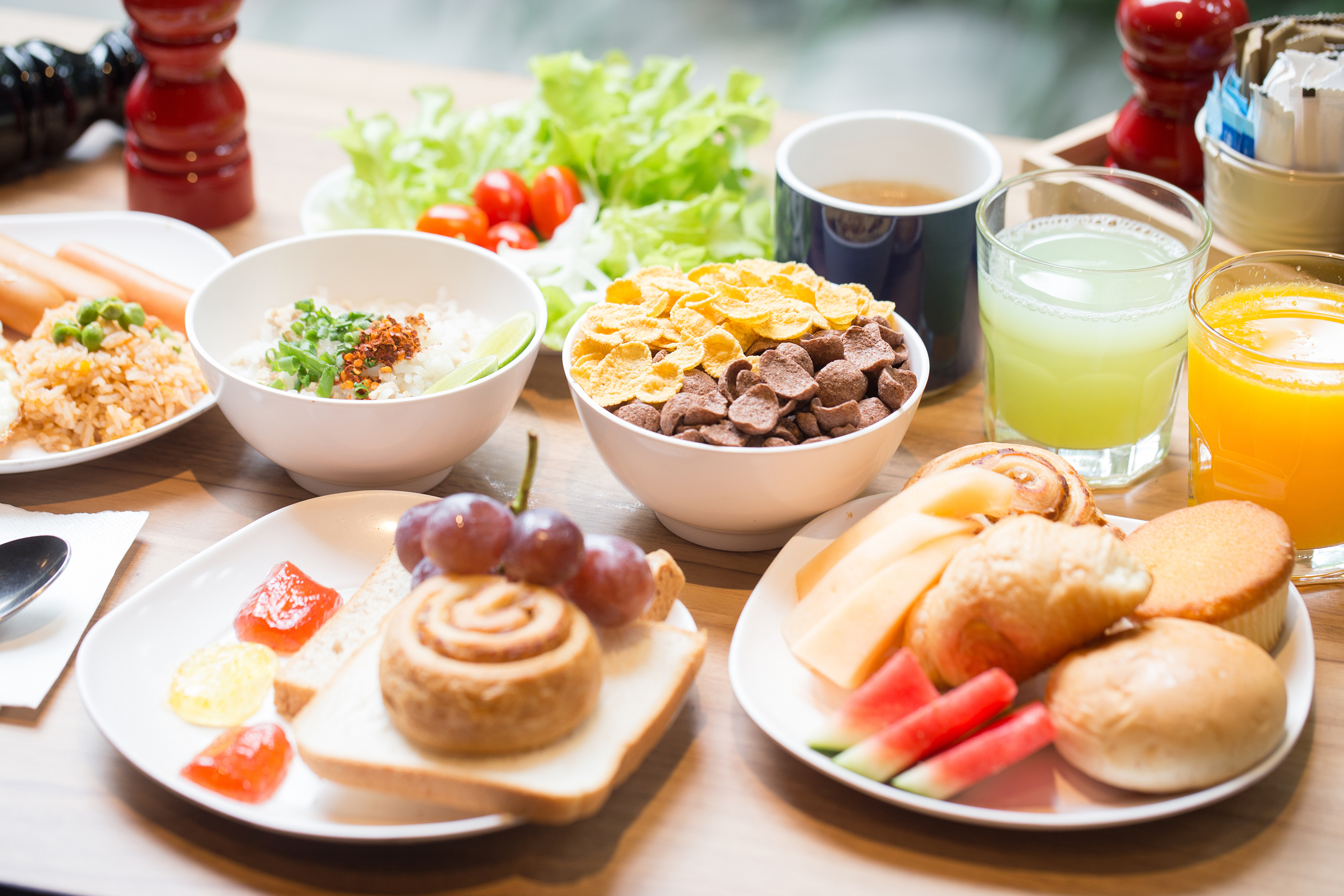 您可以享用我们免费的自助式早餐,餐点选择丰富,包括美式和亚洲风味。