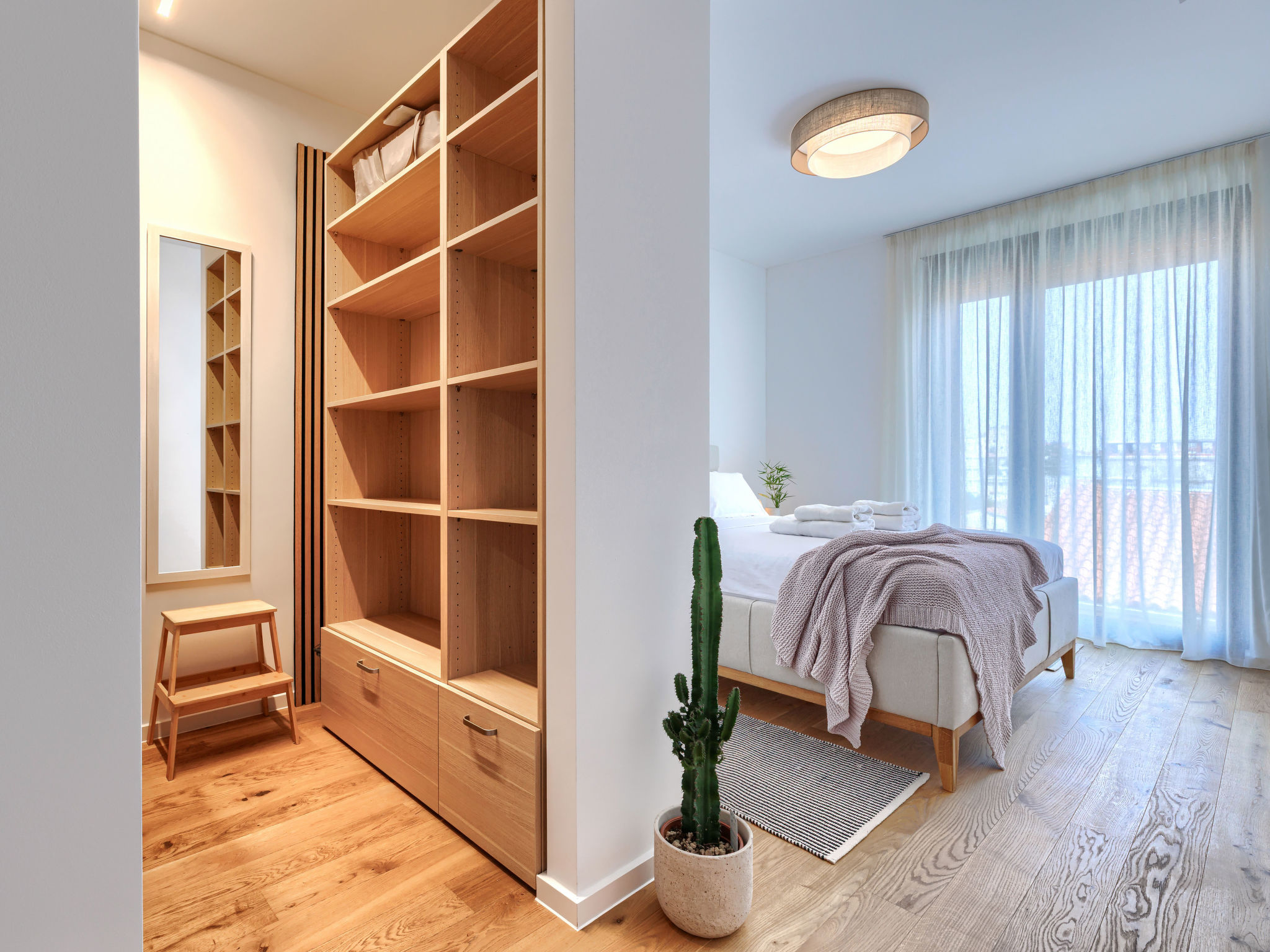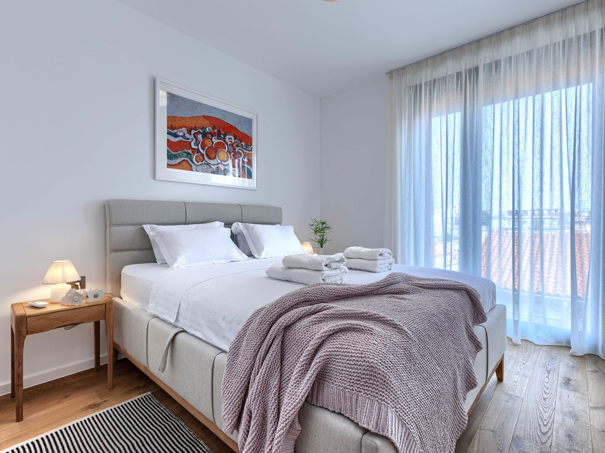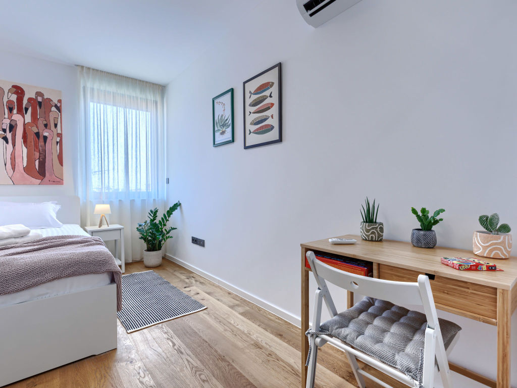 Modern apartment block. 100 m from the centre of Pula, 500 m from the sea, 3 km from the beach, located by a road. In the house: internet access, lift, central heating system, air conditioning, washing machine, tumble dryer. Roofed, parking, single garage. Shop 70 m, supermarket 200 m, restaurant 100 m, café 70 m, 5 minute walk to the centre, bus stop 50 m, railway station 1 km, ferry 500 m, sandy beach 9 km pebble beach 3 km, rocky beach 3 km. Nearby attractions: Amphitheater 500 m, National park Brijuni 6 km. "Brnistra", 4-room apartment 65 m2 on 4th floor. Living/dining room with satellite TV (flat screen). Exit to the balcony. 1 room with 1 french bed (160 cm, length 200 cm). 1 room with 1 bed (120 cm, length 200 cm), 1 pull-out bed (length 190 cm). Open kitchen (oven, dishwasher, 4 induction hot plates, toaster, kettle, freezer, electric coffee machine). Shower/WC. Balcony 6 m2. Facilities: hair dryer. Internet (WiFi, free).