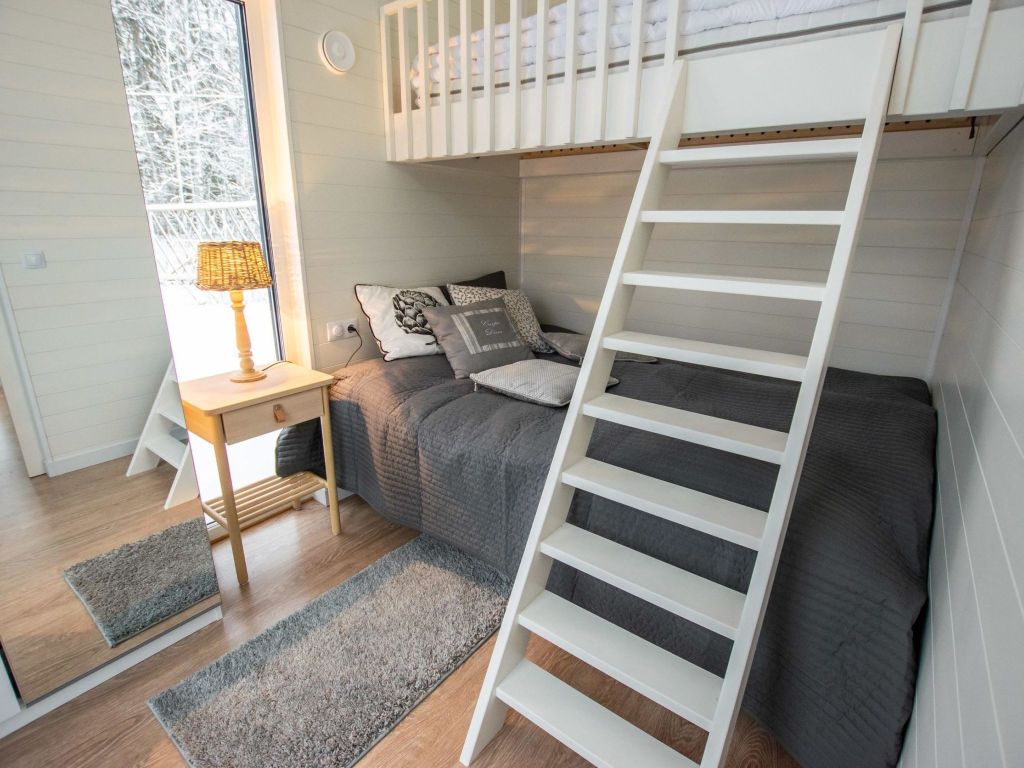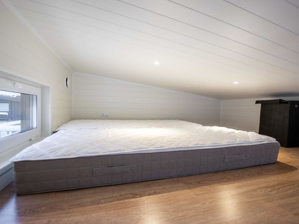 The bedroom has a double bed and a 90 cm loft bed.