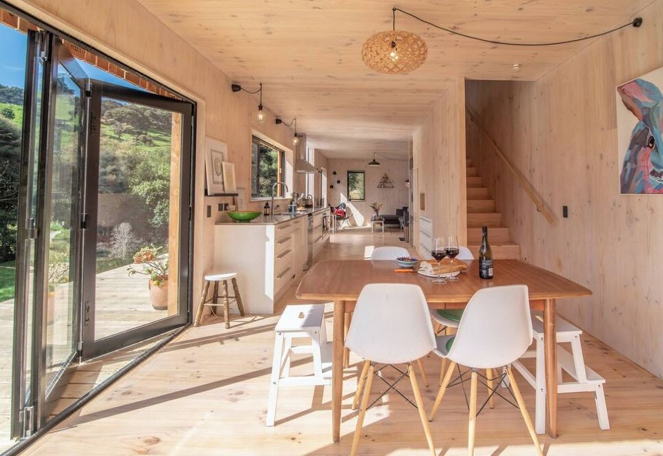 欢迎来到贝尔伯德小屋 (Bellbird Bach)——它坐落在宁静的艾尔默斯山谷 (Aylmers Valley) 的原生灌木丛中。您可以尽情享受山谷的静谧和鸟鸣,同时只需悠闲地步行 10 分钟即可到达阿卡罗阿镇中心。我们宽敞且设备齐全的厨房配备您准备度假餐点所需的一切。打开餐厅的摺叠门,即可将户外美景引入室内,并享受延伸至露台的惬意时光。楼上设有两间配备大床的卧室,宽敞的楼梯平台区域还设有双层床、浴室和洗衣区。关于宠物:禁止携带宠物。关于退房:退房时间为上午 11:00 前。关于小童:允许 13-17 岁的小童入住。开放式楼梯和无栏杆露台。关于入住:入住时间为下午 2:00 后。关于吸烟:禁止吸烟。关于活动:禁止举办任何活动。