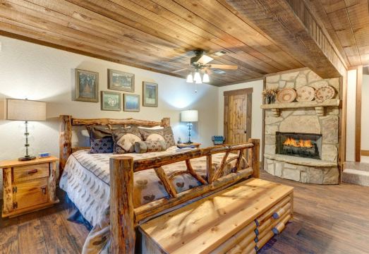 When you arrive, put your bags down and have a look around the main level. Here, you will find a massive fully-equipped kitchen with custom stone counters, a plush living room with a flat-screen TV, and a hearty gas fireplace with stone design.