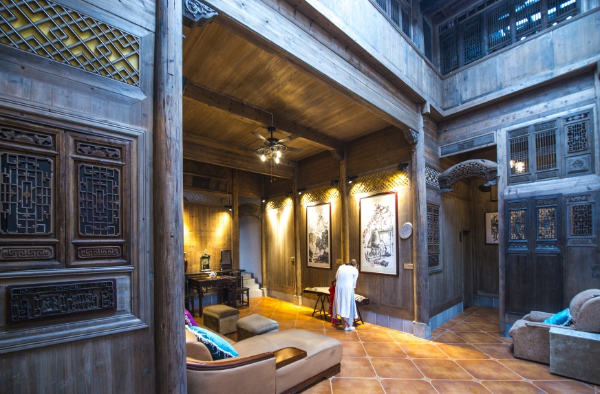 客栈配套设施齐全,高端、标准客房多间,餐厅、茶楼、草堂,书画室、游泳池、垂钓一应俱全,打造成黄山市较大的、具有品位的品牌徽州园林盆景文化综合产业园。