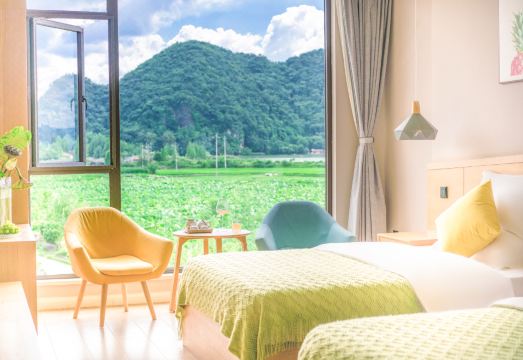 心愿缘起在心中一直有一个心愿,就是要有一个带庭院的房子,可以枕山眠,望见湖、院子里开满鲜花 、阳光能照进每一个空间,宽阔的天台上,闲时喝茶、赏花、赏月、赏风景。清风徐来,邀二三好友,煮酒品茗,院子里的玫瑰、小草、蝴蝶、藤椅、孩子的笑容……曾经梦想的雅致生活,已然成为随处可见的油画。普者黑:一个被灵魂牵引的地方放眼望去,远山如黛,湖光泛色,碧水连天。山峦青翠,山林野趣,浑然天成。犹如海山环抱的人间仙境。荡舟其间,如在画廊中穿行。从容于心 淡定于行旅行的意义到底是什么呢?是闪着荧光的湖水,还是那暖暖的清风,是我们眼前满目的美景,还是你迎着风羞怯微笑的面容,从容于心,淡定于行开启智慧之旅,一起遥望远去的云淡风清,再看现实的花开花落…旅所当然——遇见人生最美风景普者黑旅所当然精品閲湖酒店,位于云南省文山壮族苗族自治州丘北县普者黑村古井园荷花湖畔,地处国家AAAA级旅游景区普者黑景区核心位置青龙山对面,樱花景观大道直达酒店,毗邻普者黑喀斯特国家湿地公园、青龙山、月亮洞、火把洞、观音洞、天鹅湖、舍得草场等景区,公交可直达普者黑高铁站,游客步行即可到情人桥、青龙山码头、《三生三世十里桃花》外景拍摄地。旅所当然是一个自然美学旅居酒店,是一个体验诗和远方的目的地。设计理念采用传统外观搭配现代室内,简约硬装结合文化软装,完美构造成了花砖白墙+花香庭院+新美学设计空间。酒店由一栋2层半18间观山閲湖客房和画廊大堂、景观庭院、书吧餐厅、屋顶露台的公共空间组成,浑然天成的让你真实享受“睡在浅山半水里,住在人文艺术家”的意境。 我们致力为你在美景中找到生活本来的样子,提供“一半世界,一半家”的体验旅居生活方式。