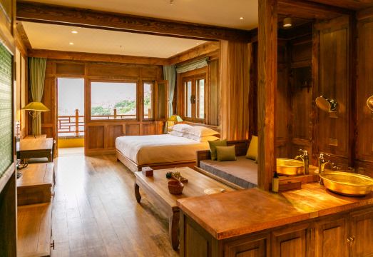 芒康松赞如美山居位于如美镇竹卡村,芒康,是松赞滇藏线从云南进入西藏境内的第一站,也是进入藏区的必经之路。松赞芒康如美山居是整条松赞滇藏线上最早落地的项目,它位于海拔2600米的河谷台地上,北边毗邻竹卡村落,南边是广阔的农田,视野开阔。芒康松赞如美山居共有二十余间客房,主楼朝向澜沧江,景观全面打开,确保每一间客房都能俯瞰澜沧江和近处碧绿的梯田,宛如一幅色彩浓郁的油画。在配色上,酒店采用了绿、黄、白、孔雀蓝等亮丽颜色,与窗外天空、雪山、河流、田地的颜色彼此呼应。山居的院落中特别设计了原生态水循环系统景观,运用梯田到澜沧江下降的自然坡度,从较高的小水池注入到镜面池,再坠落形成Spa水疗房前的小瀑布,用丰富的水循环景观,为这个较干旱的区域增添更多水润光彩。